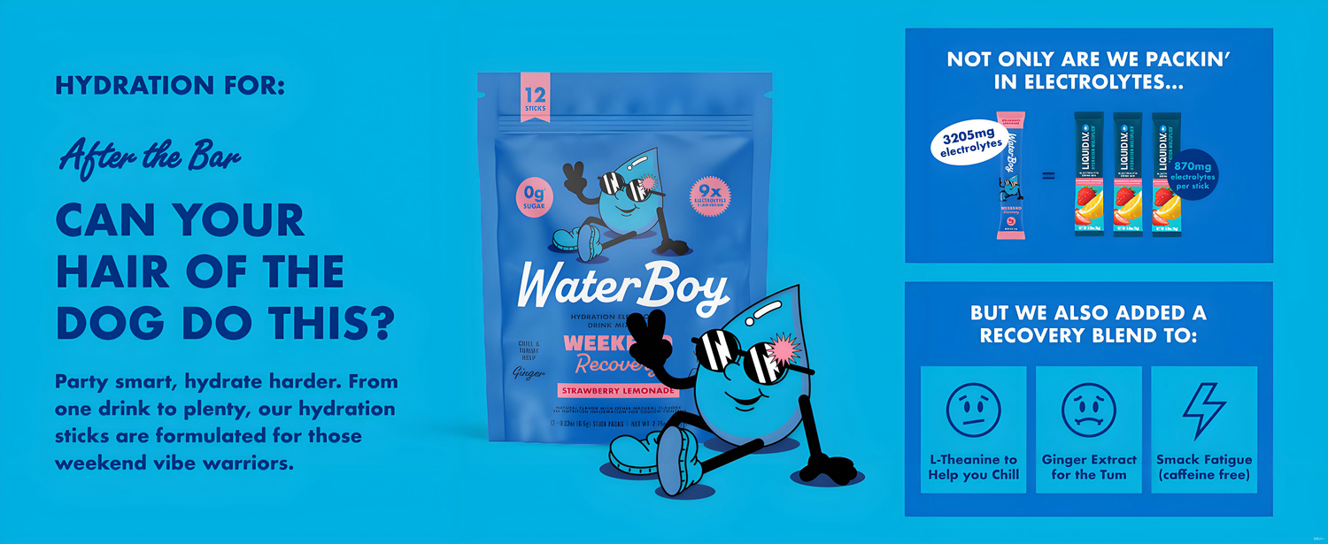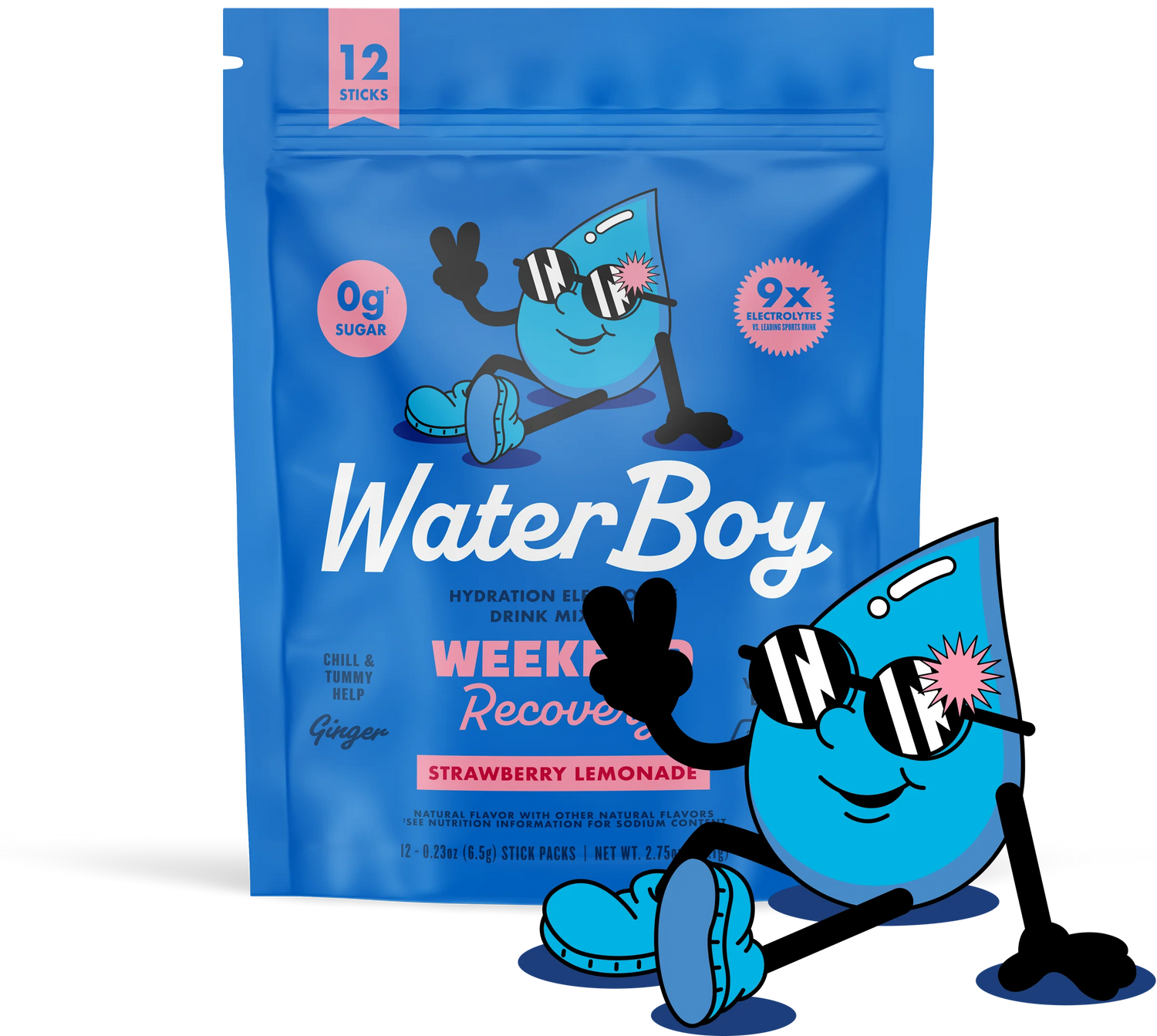 Waterboy Weekend Recovery Electrolyte Powder combines Ginger, L-Theanine, and Vitamins to help your body restore hydration, calm your mind, and beat fatigue after late nights or long days.