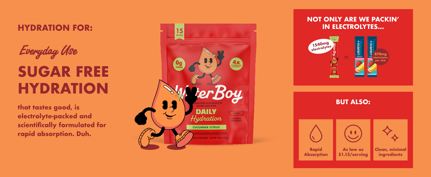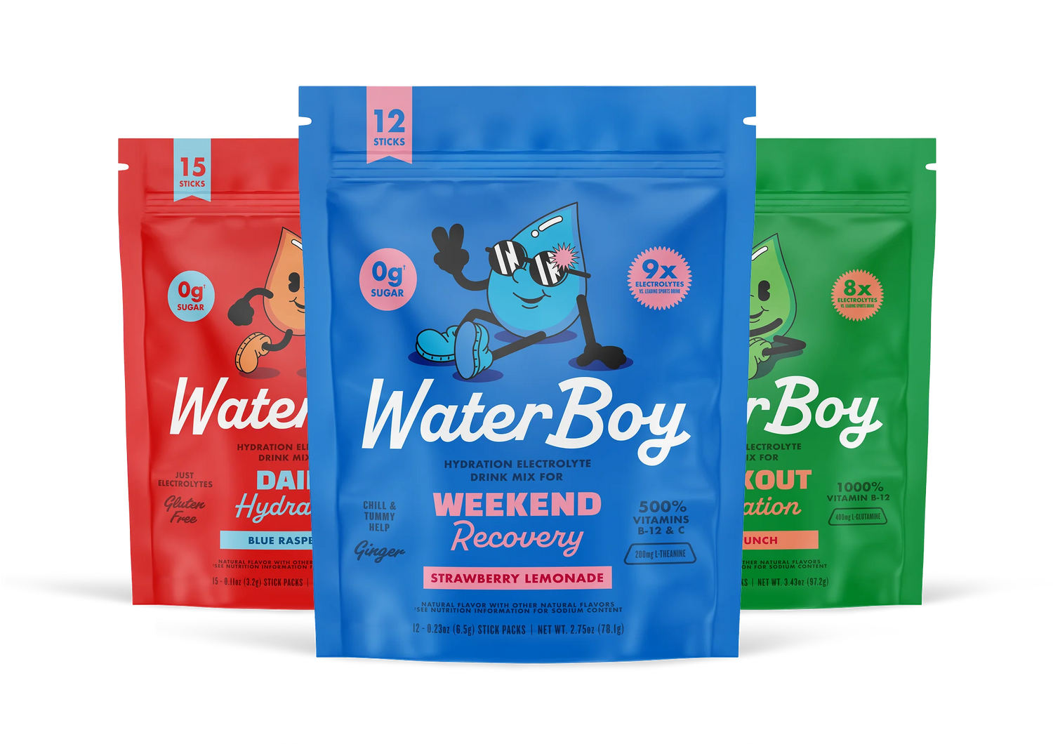 Waterboy is a smarter hydration solution β formulated with clean, all-natural ingredients, zero sugar, and functional nutrients like L-Theanine, L-Glutamine, and Ginger Extract.