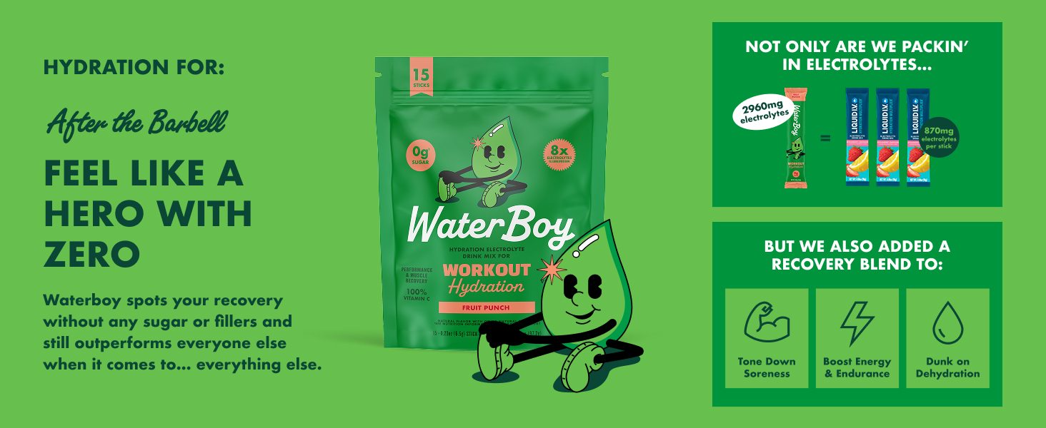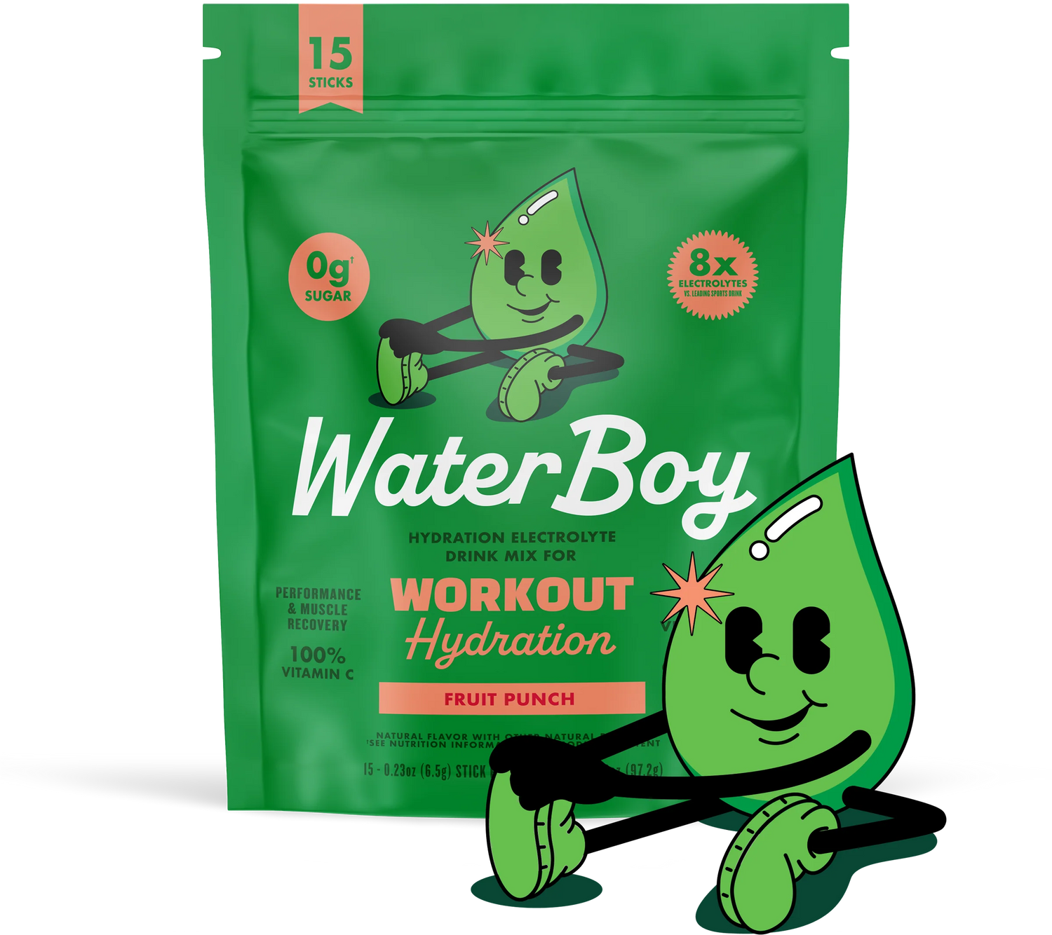 Waterboy Workout Hydration is powered by L-Glutamine, Electrolytes, and Vitamins for next-level endurance and muscle recovery.
